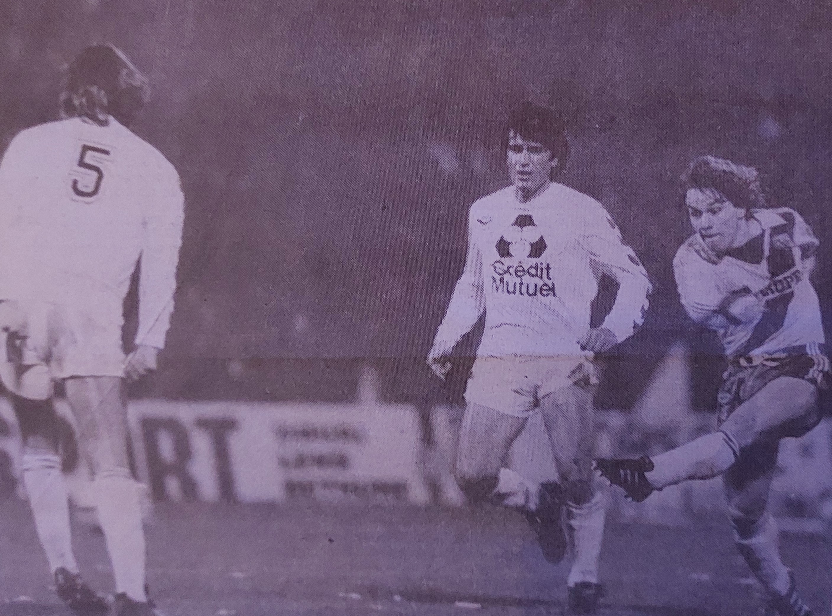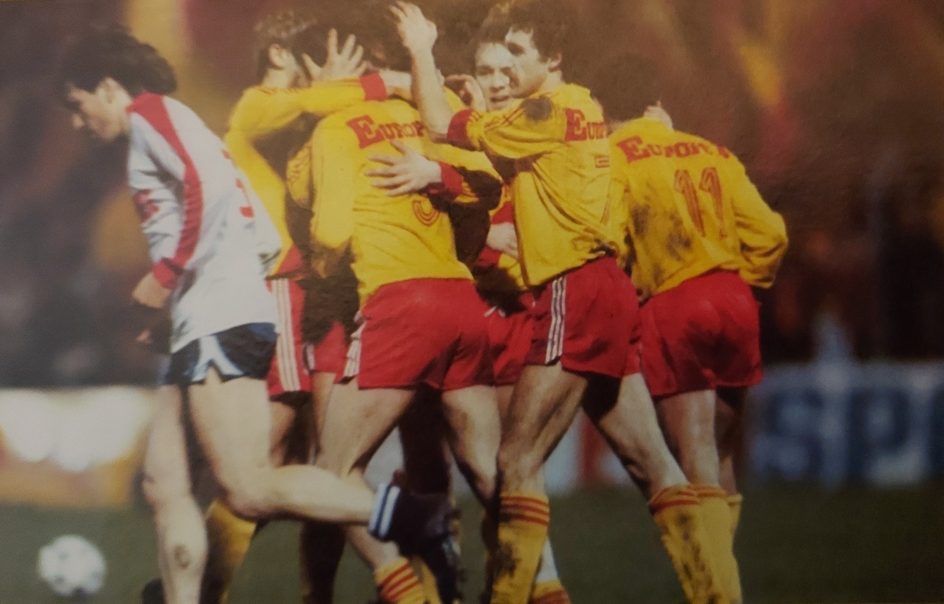 Résultat Lens – Lille 2-0 et 2 buts de Phiippe Vercruysse. Ci-contre, Didier Christophe la tête basse et le groupe de lensois Brisson, Piette, Xuereb et Vercruysse qui s'embrassent... l'un a perdu et les autres ont gagné.