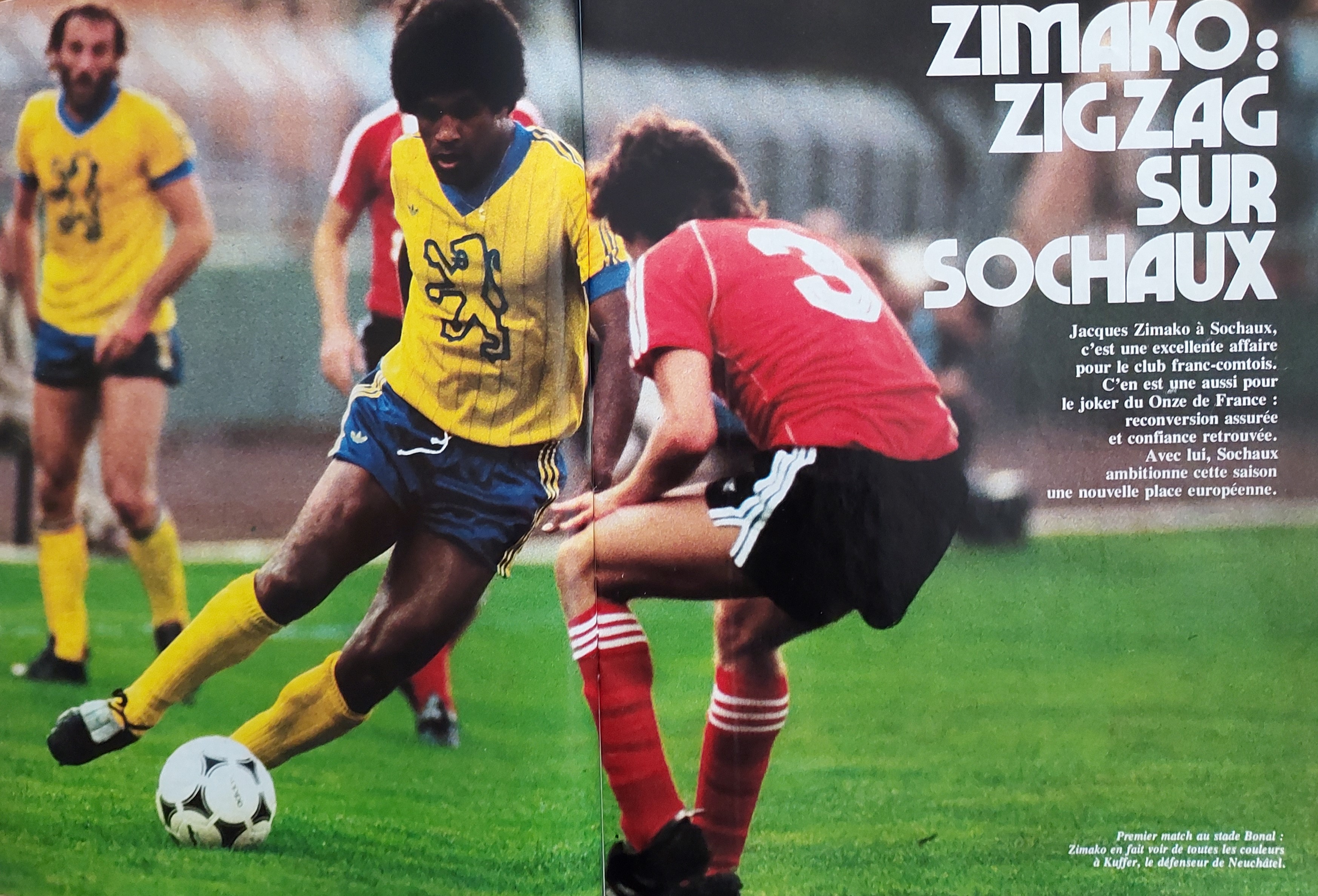 Arrive la saison 1981 et le transfert de Jacques ZIMAKO à SOCHAUX. Ci-dessus, lors de son premier match à BONNAL ou il en fera voir de toutes les couleurs au défenseurs suisse de NEUCHATEL. Et oui, il a décliné l'offre de St ETIENNE pour prolonger son contrat, et a opté pour le club franc-comtois. A SOCHAUX, pas de frime, pas de grosses têtes, et ça, ça lui plait. Tout le monde connaît tout le monde. A St ETIENNE il commençait à perdre confiance, à SOCHAUX il va retrouver l'envie de marquer. Il sera surnommé le "brésilien de Sochaux", ben oui, lui, il sait apporter sa dose de fantaisie dont sont friands les supporters. Demandez au gardien de NEUCHATEL (international suisse), ENGEL est reparti avec 6 buts dans sa besace, dont 2 de Jacques. Quelle équipe de feu avec REVELLI, STOPYRA, GENGHINI...