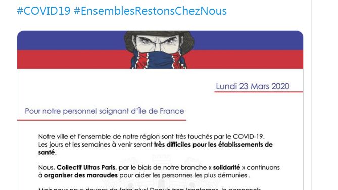 Le Collectif Ultras Paris a donc décidé de se mobiliser pour apporter un petit soutien (grand dans l'état d'esprit) aux soignants. En effet, le CUP a mis en place une cagnotte en ligne : https://www.lepotsolidaire.fr/pot/xc0d6iul dont les fonds seront reversés aux hôpitaux de Paris, "afin de leur apporter du réconfort dans leur salle de pause (panier repas, etc ...)".